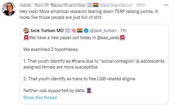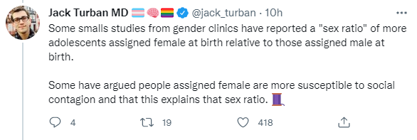 Anyhoo, I have a hard time accepting, that of the circa 1100 students at our local high school, there are now at a very minimum, 6 trans kids in one grade, and that this stat is nothing to do with social contagion. I am just one mum, at the coal face of this, so if I can see the pattern emerging how on earth can the likes of Dr Turban not.
