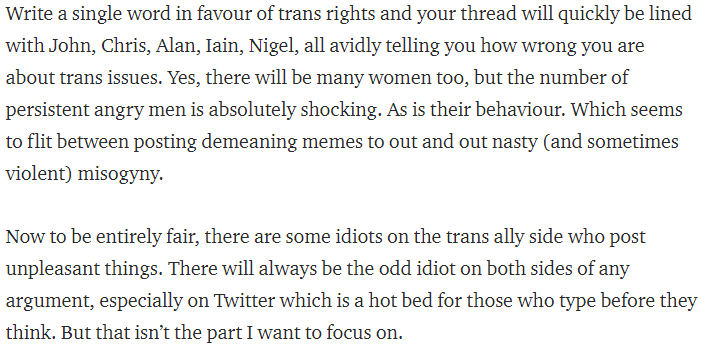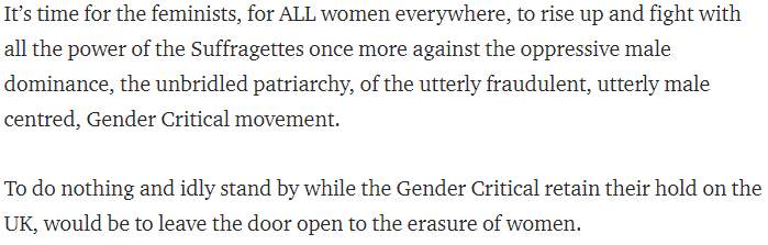 She looks at data from a couple of other surveys, which also show that men are more likely to hold gender critical views – which is what you’d expect, if the results of the first survey were a real effect – and takes this as undeniable proof that men are leading the GC movement. How, then, to account for all of the women who are very vocal in the same movement? In one of the most genuinely remarkable paragraphs I have ever seen in a blog, that must also be the high-water mark of denying women agency, all these remarkable women are written off because they work with men!