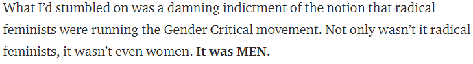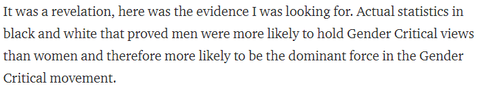 …it does also use survey data to ‘prove’ its central thesis, and that’s of interest to me. Hence me valiantly overcoming the crippling irony of a gender critical man arguing that men don’t run the gender critical movement to write this short piece.